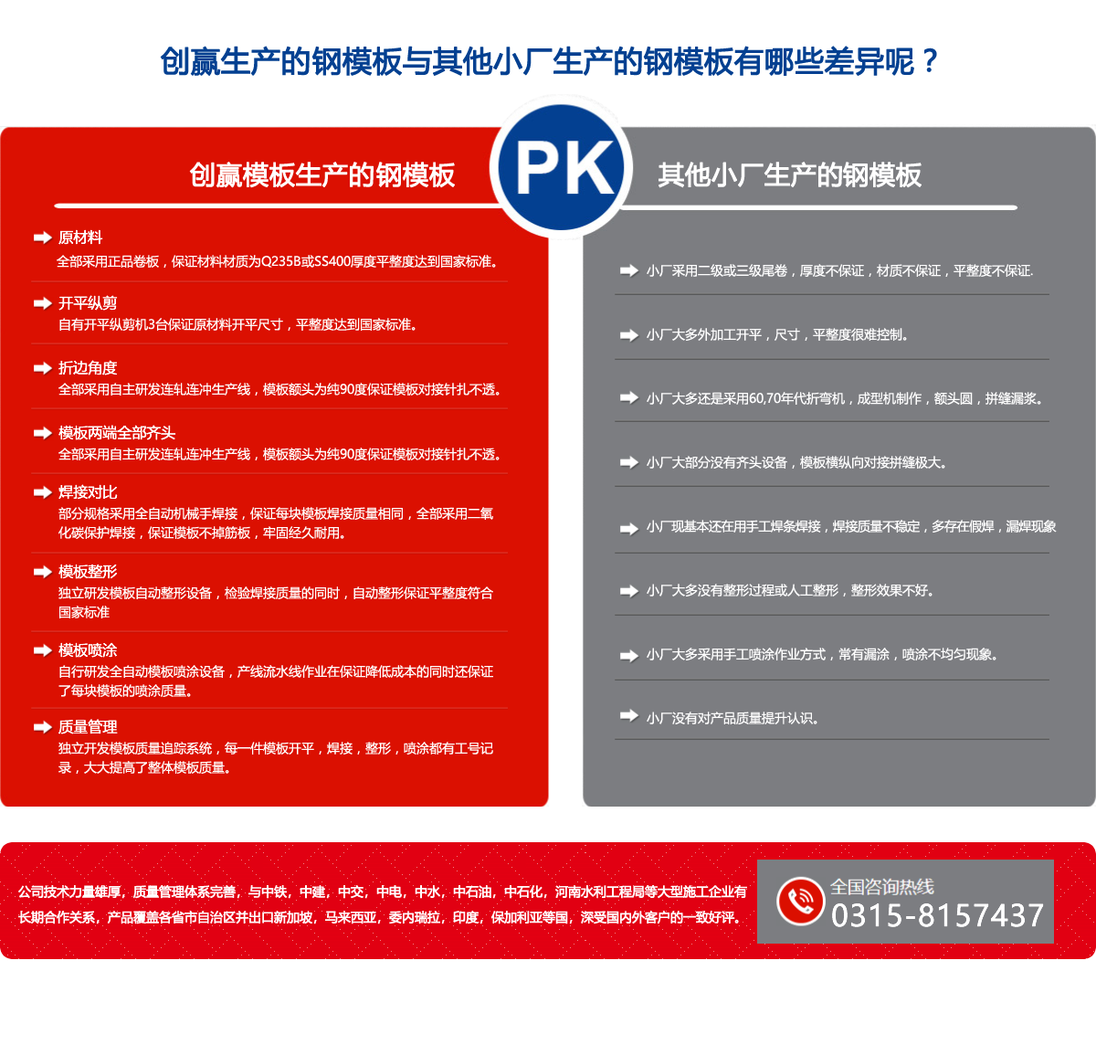 唐山創(chuàng)贏模板有限公司(原唐山豐南雙贏金屬結(jié)構廠)始建于一九九七年,是具規(guī)模實力的組合模板生產(chǎn)企業(yè),公司自行設計制造的十二條上卷,連軋,連沖,整形,機械人焊接,調(diào)直,噴漆,打包鋼模板生產(chǎn),實現(xiàn)了自動化一條龍生產(chǎn),品質(zhì)優(yōu),效率高,規(guī)格型號為:寬度100-1200mm, 長度300-3000mm, 板厚1.8-4.0mm。
